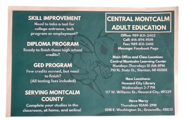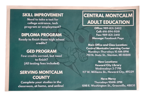 Whether you're looking to finish your diploma, prepare for a GED, or improve your skills for college or employment, Central Montcalm Adult Education is here to help. Offering flexible class options and multiple locations, this program is designed to fit your busy schedule and help you achieve your educational goals.