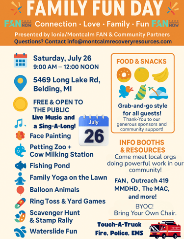 Join us on Saturday, July 26th from 9AM to Noon at 5469 Long Lake Rd in Belding for a free, family-friendly celebration filled with music, games, a petting zoo, waterslide, snacks, local resources, and tons of fun for all ages!