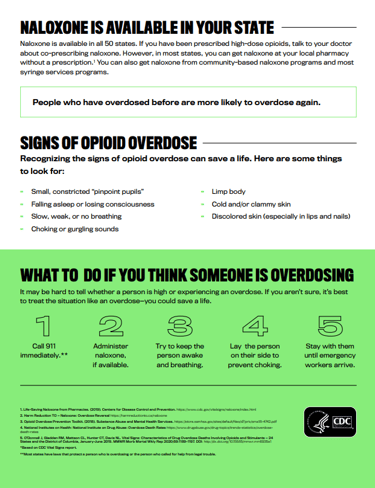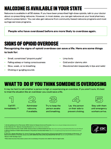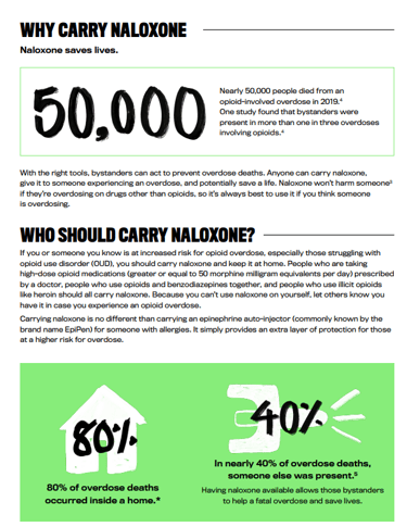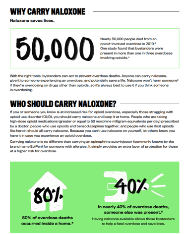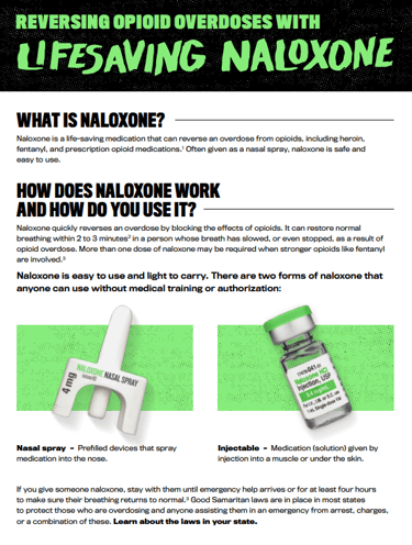 If you are a person who uses drugs or if you are around people who use drugs, please consider learning how to respond to an opioid overdose and carrying naloxone (intranasal brand name: Narcan). Naloxone is a medication designed to reverse an opioid overdose. Opioids slow down the activity of the central nervous system. This can cause slowed or stopped breathing which may lead to death. Naloxone displaces the opioids from the opioid receptors in the brain which allows the person who is experiencing an opioid overdose to begin breathing normally.