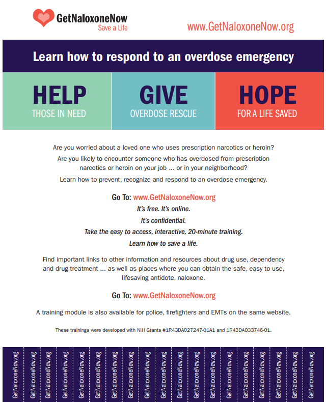 In as little as 20 minutes, you can learn techniques to save the life of a loved-one, friend, co-worker, neighbor ... anyone ... who is experiencing an overdose caused by prescription narcotics or heroin.