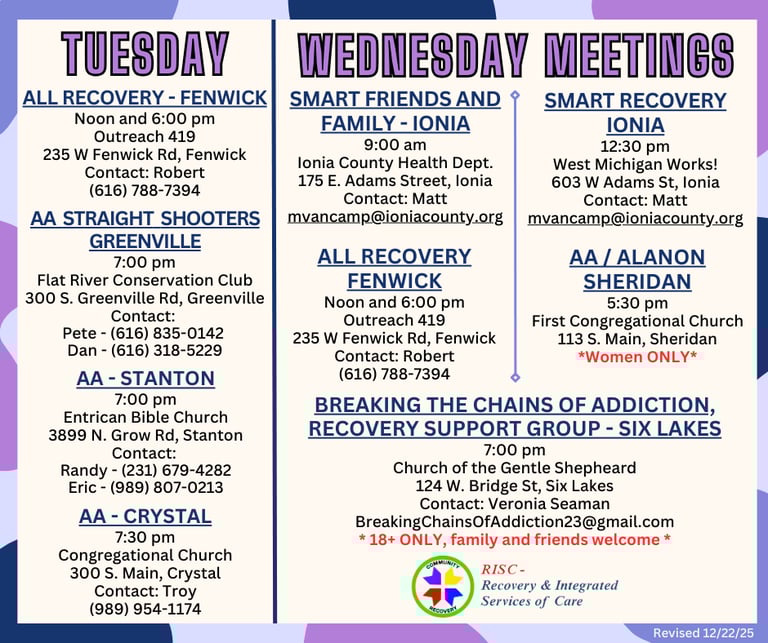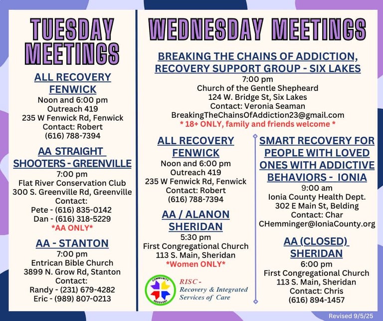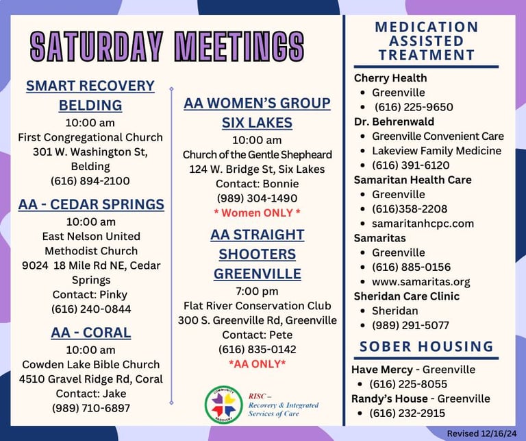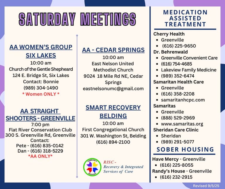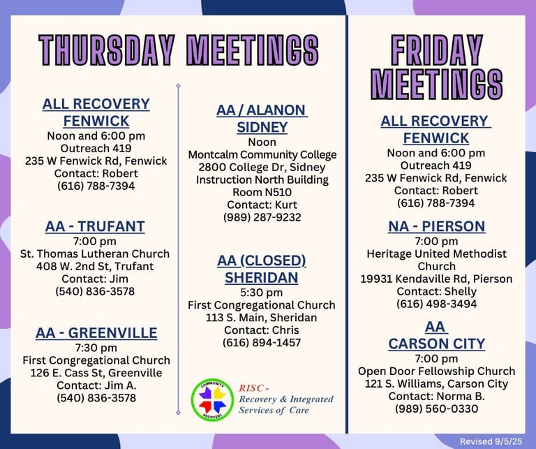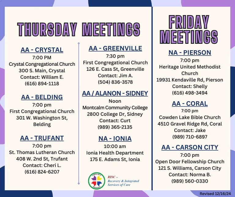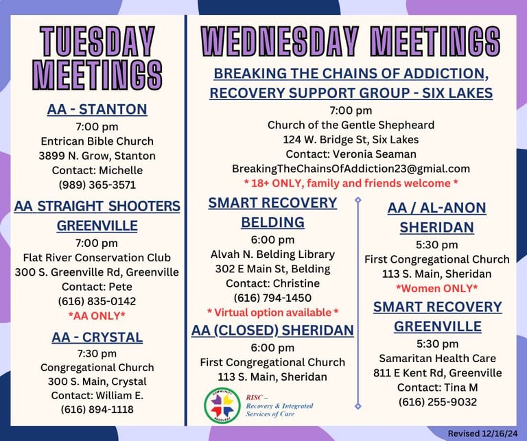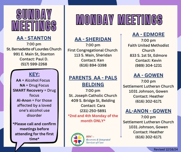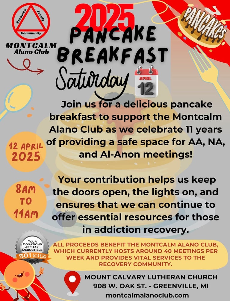 Please visit the Montcalm Alano Club Website to confirm meeting times. Click any image below to enlarge